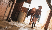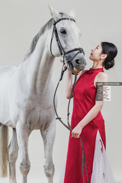 图片标题: 红裙女子与白马