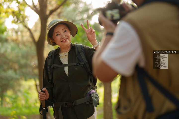 图片标题: 徒步旅行的老年夫妇拍照
