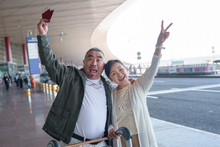 图片标题: 一对幸福的老年夫妇徒步旅行