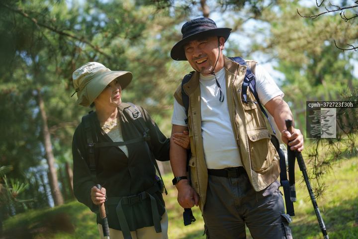 图片标题: 一对幸福的老年夫妇徒步旅行