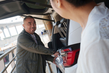 图片标题: 一对老年夫妇在机场从汽车上搬运行李