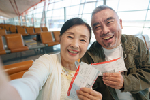 图片标题: 徒步旅行的老年夫妇拍照