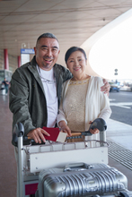 图片标题: 一对老年夫妇站在机场休息室窗户前