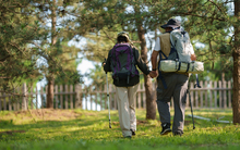 图片标题: 一对幸福的老年夫妇徒步旅行