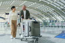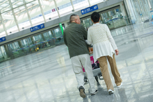 图片标题: 一对幸福的老年夫妇在机场展示机票