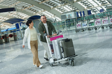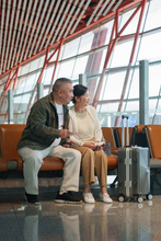 图片标题: 一对幸福的老年夫妇在机场展示机票
