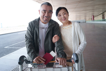 图片标题: 一对幸福的老年夫妇徒步旅行