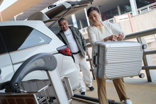 图片标题: 一对老年夫妇在机场从汽车上搬运行李