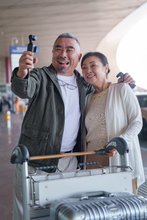 图片标题: 一对幸福的老年夫妇徒步旅行
