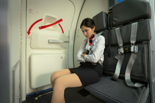 图片标题: 一位青年女乘务员在机舱内检查行李