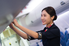 图片标题: 一位青年女乘务员在机舱内工作