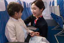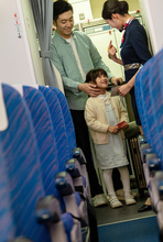 图片标题: 一位青年女乘务员在机舱内给乘客发食品