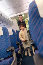 图片标题: 一位青年女乘务员在机舱内给乘客发食品