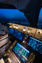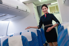 图片标题: 一位青年女乘务员在机舱内给乘客发食品