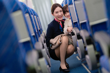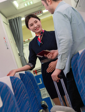 图片标题: 一位青年女乘务员在机舱内检查行李