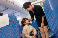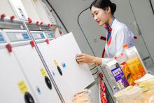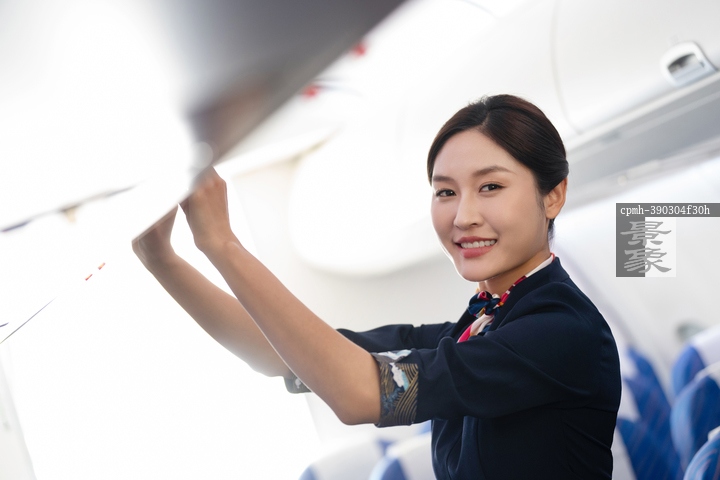图片标题: 一位青年女乘务员在机舱内检查行李