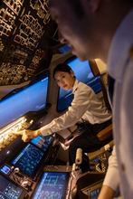 图片标题: 一位青年女乘务员在机舱内工作