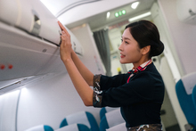 图片标题: 一位青年女乘务员在机舱内照顾睡觉的小女孩