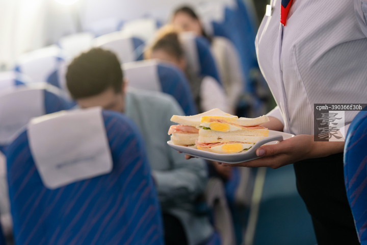 图片标题: 一位青年女乘务员在机舱内给乘客发食品
