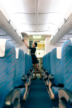 图片标题: 一位青年女乘务员在机舱内照顾小女孩