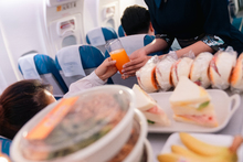 图片标题: 一位青年女乘务员在机舱内给乘客发食品