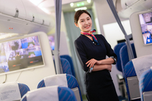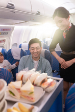 图片标题: 一位青年女乘务员在机舱内准备食物