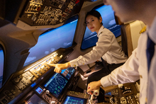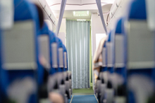 图片标题: 一位青年女乘务员在机舱内工作