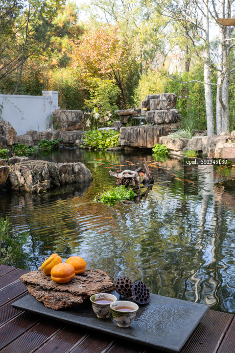 图片标题: 秋日池塘边的茶具