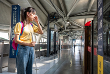 图片标题: 一位盲人女性使用导盲杖在地铁站等候列车