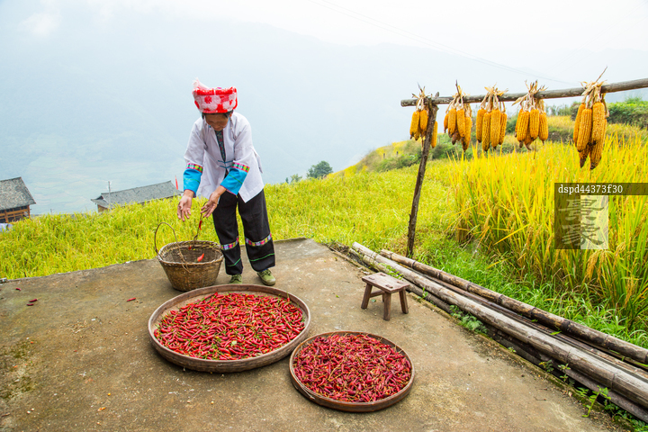 图片标题: 广西龙胜县和平乡古壮寨村阿婆在晒红辣椒