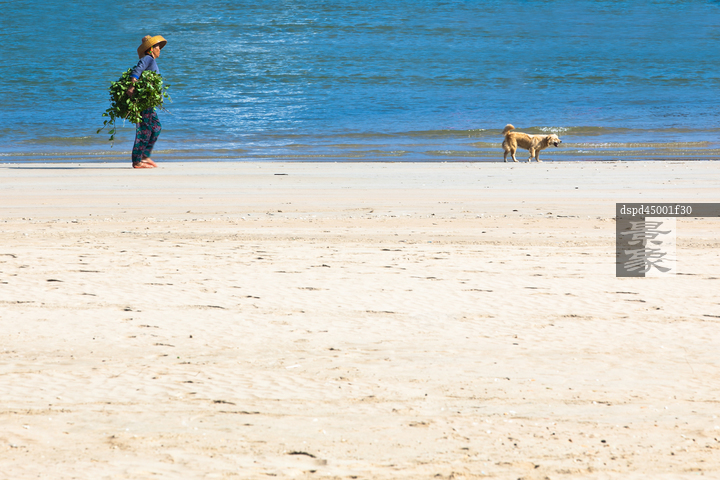 图片标题: 海边漫步的农民与狗