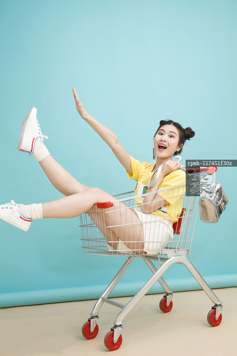 图片标题: 年轻女孩坐在购物车里