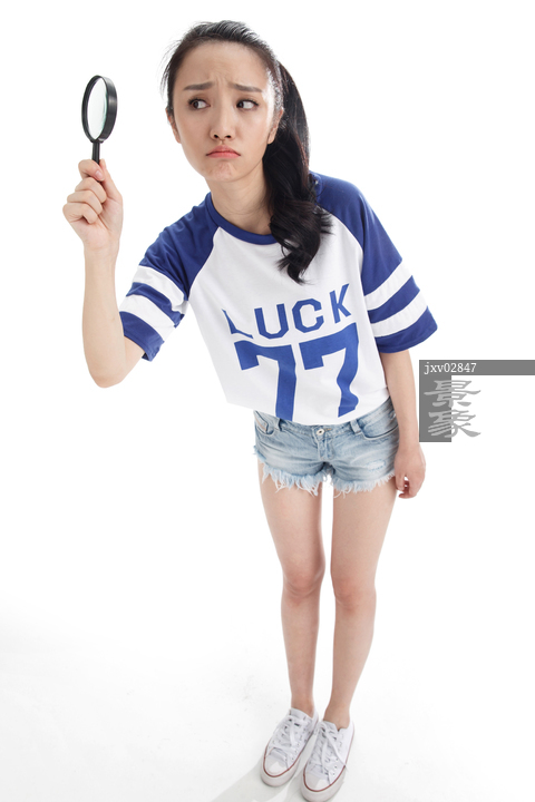 图片标题: 年轻女孩拿着放大镜
