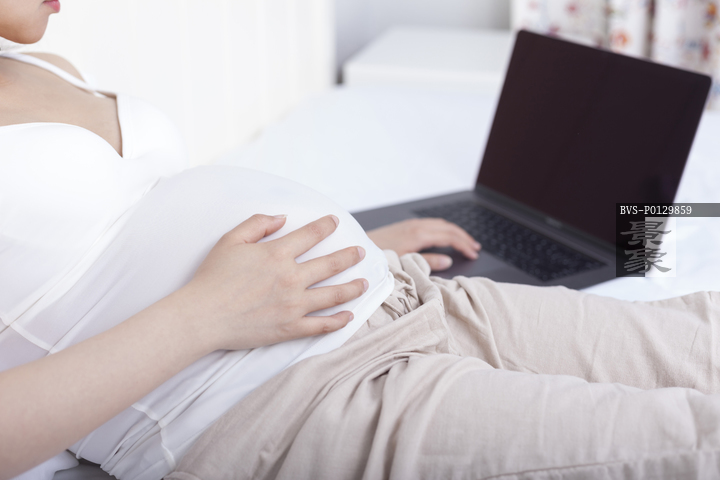 图片标题: 孕妇坐在床上使用笔记本电脑
