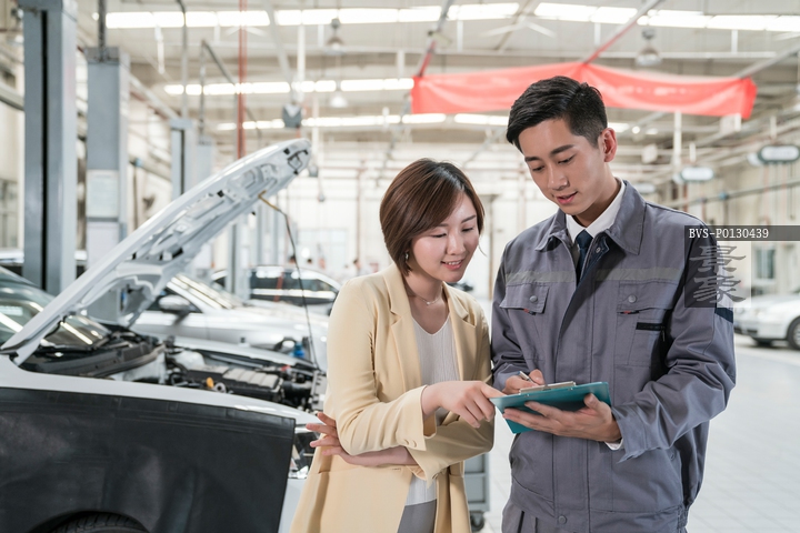 图片标题: 维修车间的汽修人员与客户