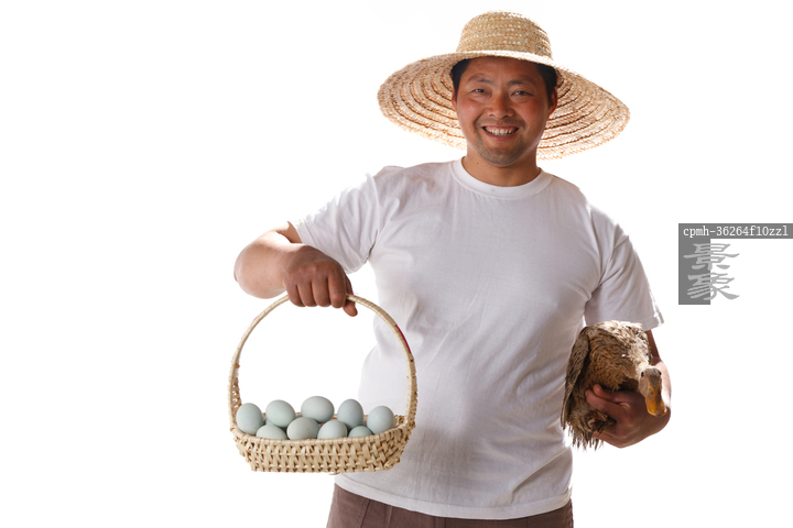 图片标题: 一个农民手拿鸭子和鸭蛋