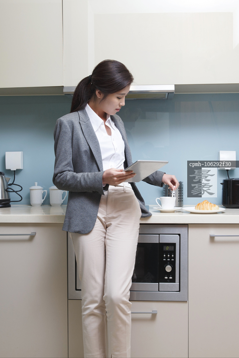 图片标题: 青年女人在厨房使用平板电脑