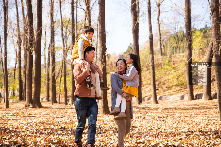 图片标题: 幸福家庭在树林里玩耍