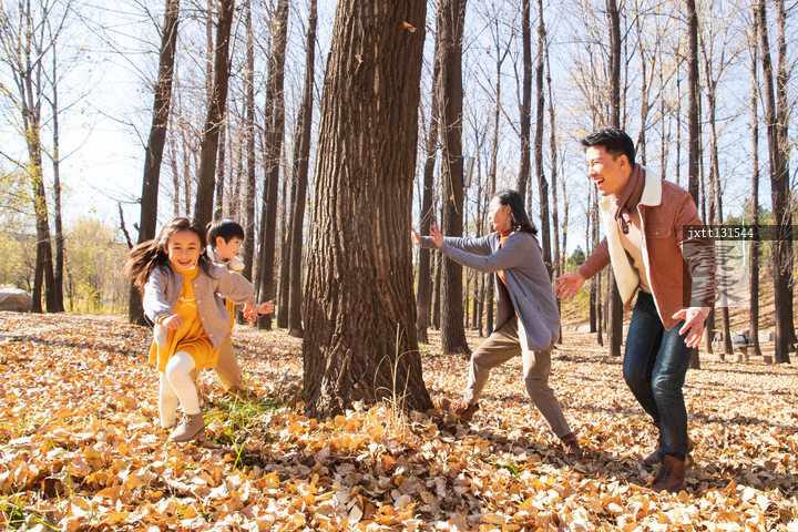 图片标题: 欢乐家庭在户外玩捉迷藏游戏