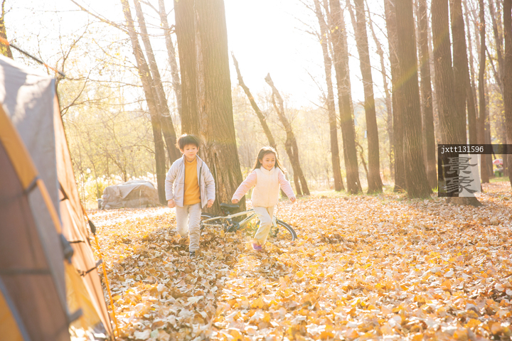 图片标题: 快乐儿童在树林里玩耍