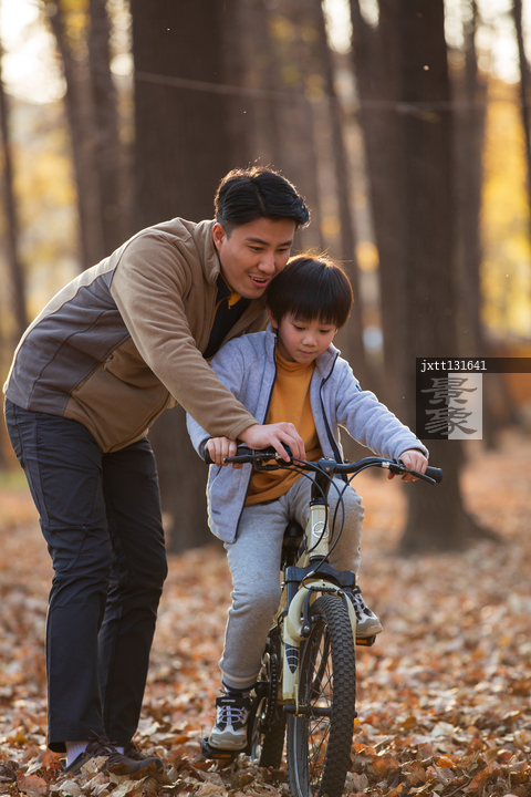 图片标题: 青年父亲教孩子骑自行车
