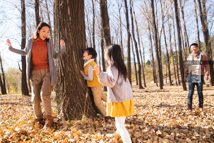 图片标题:     欢乐家庭在户外玩捉迷藏游戏