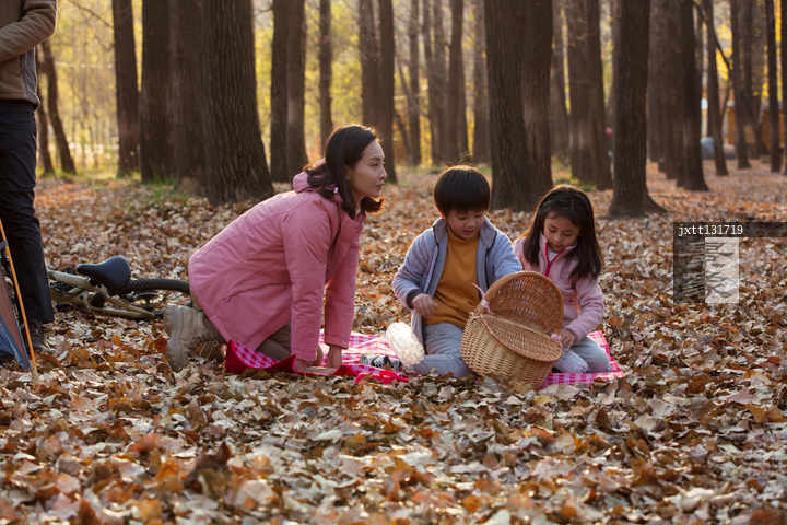图片标题: 快乐家庭在树林里玩耍