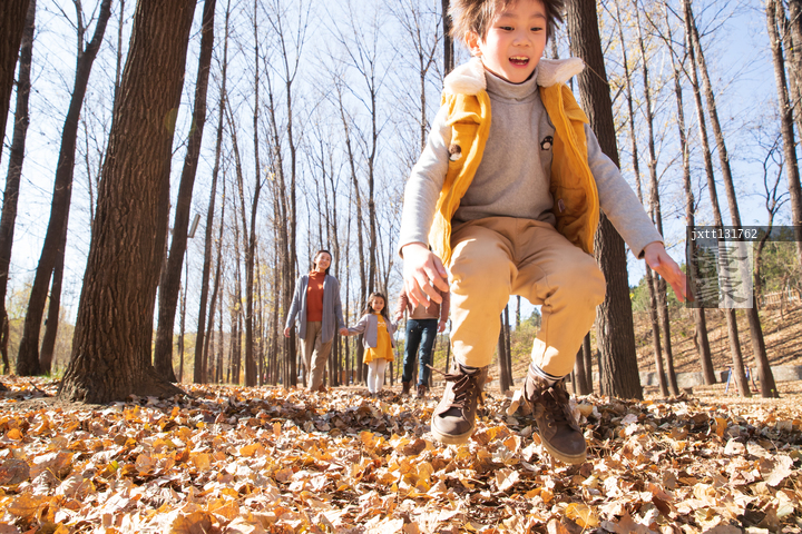 图片标题: 快乐家庭在树林里玩耍