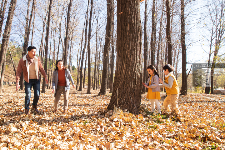 图片标题: 欢乐家庭在户外玩捉迷藏游戏