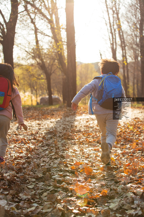 图片标题: 背着书包的小朋友在树林里徒步旅行