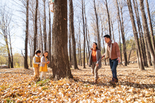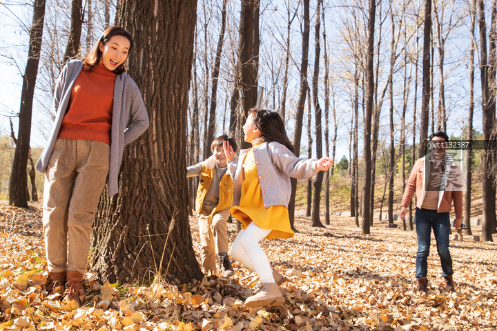 图片标题: 欢乐家庭在户外玩捉迷藏游戏