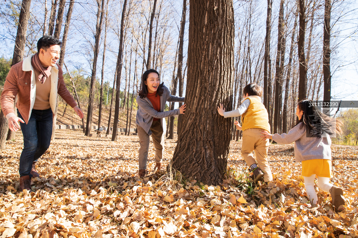 图片标题: 欢乐家庭在户外玩捉迷藏游戏