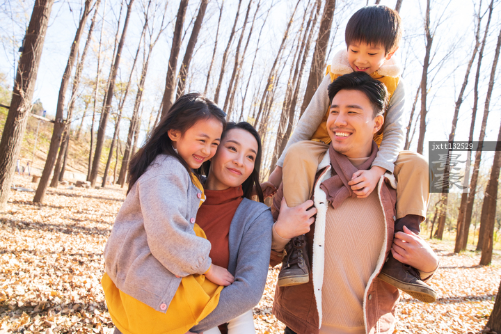 图片标题: 幸福家庭在树林里玩耍