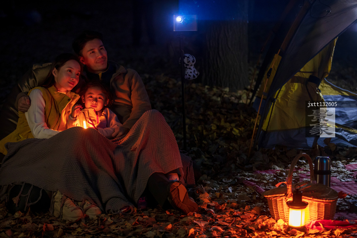 图片标题: 一家三口夜晚在野外露营